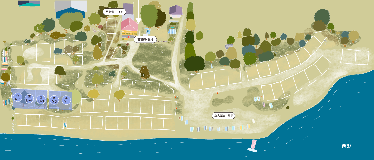 西湖の水位により区画数が変動する場合がございます。 敷地内に貸しボート屋さんのエリア等、テントを張ってはいけない場所がありますのでご注意ください。